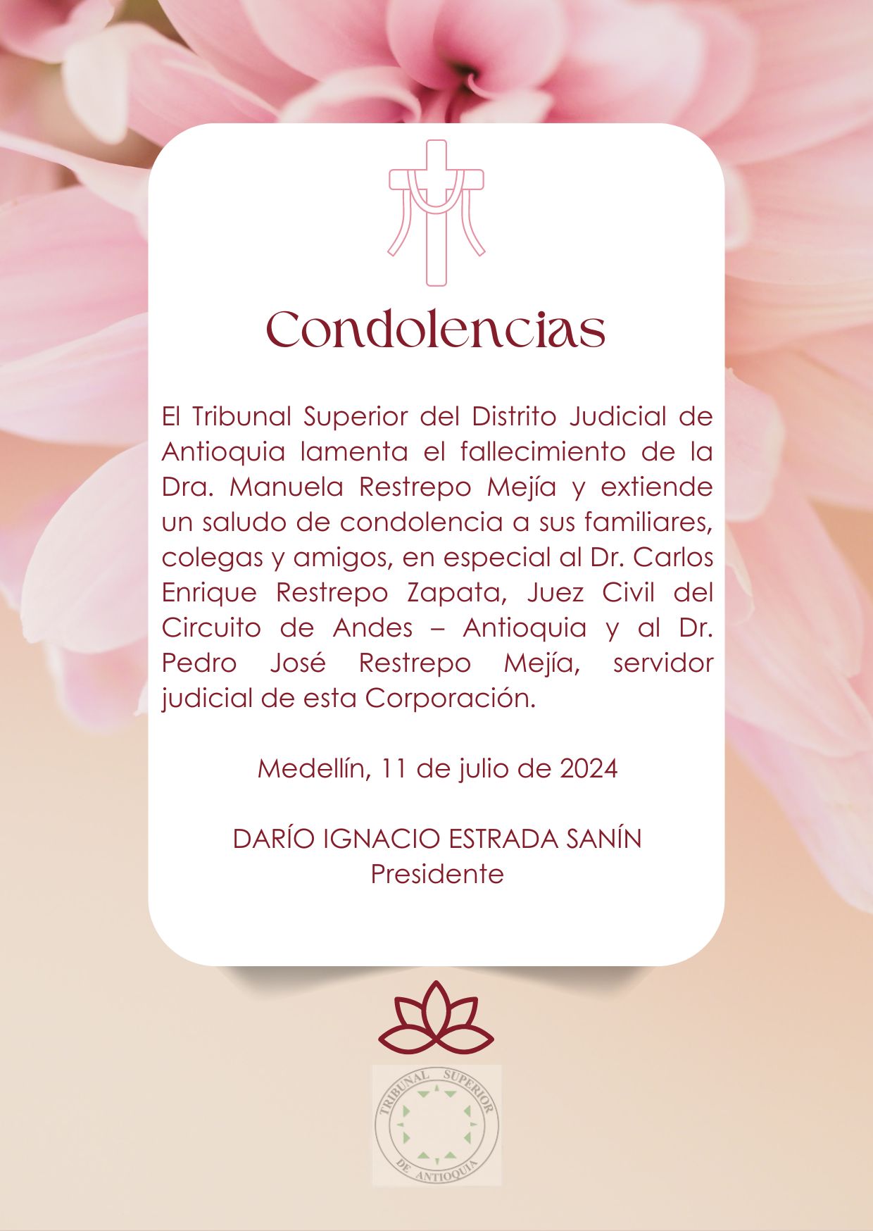 El Tribunal Superior del Distrito Judicial de Antioquia lamenta el fallecimiento de la Dra. Manuela Restrepo Mejía, hija del Dr. Carlos Enrique Restrepo Zapata, Juez Civil del Circuito de Andes.