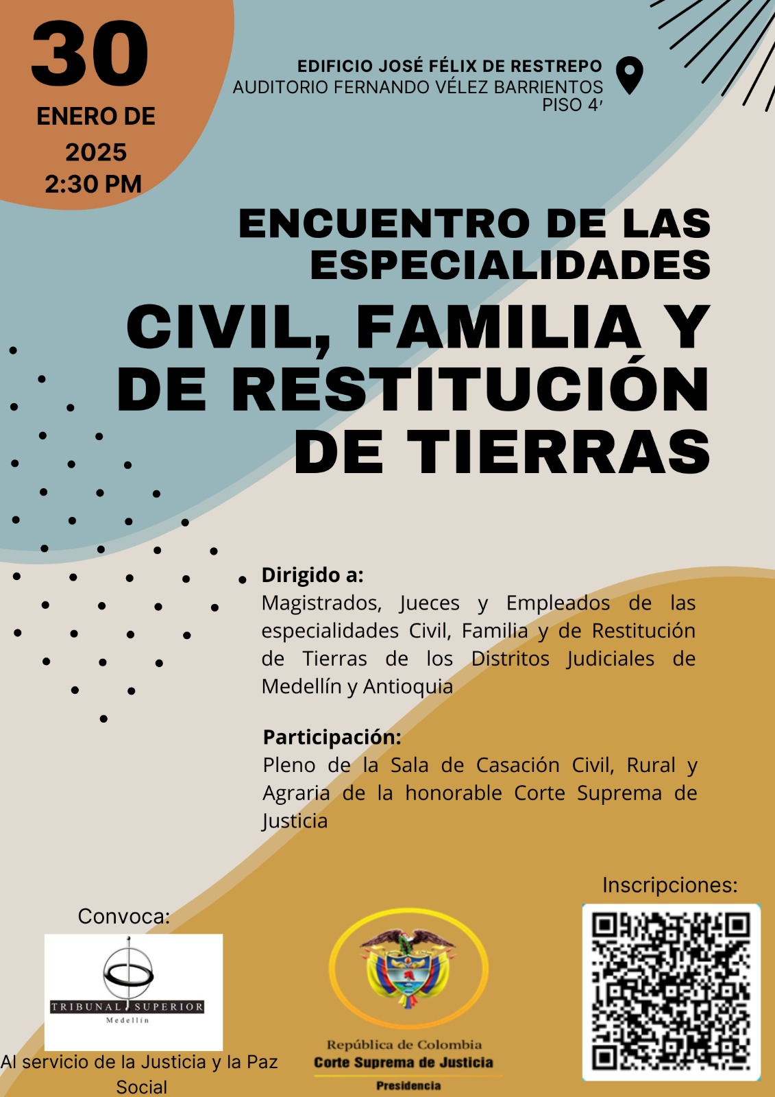 El Tribunal Superior del Distrito Judicial de Medellín, con la participación de la Sala de Casación Civil, Rural y Agraria de la honorable Corte Suprema de Justicia y la Salas Civil Especializada en Restitución de Tierras y Civil Familia del Tribunal Superior del Distrito Judicial de Antioquia, realizarán el Encuentro de las Especialidades Civil, Familia y de Restitución de Tierras el próximo 30 de enero a partir de las 2:30 de la tarde, en el auditorio del Edificio José Félix de Restrepo, piso 4.