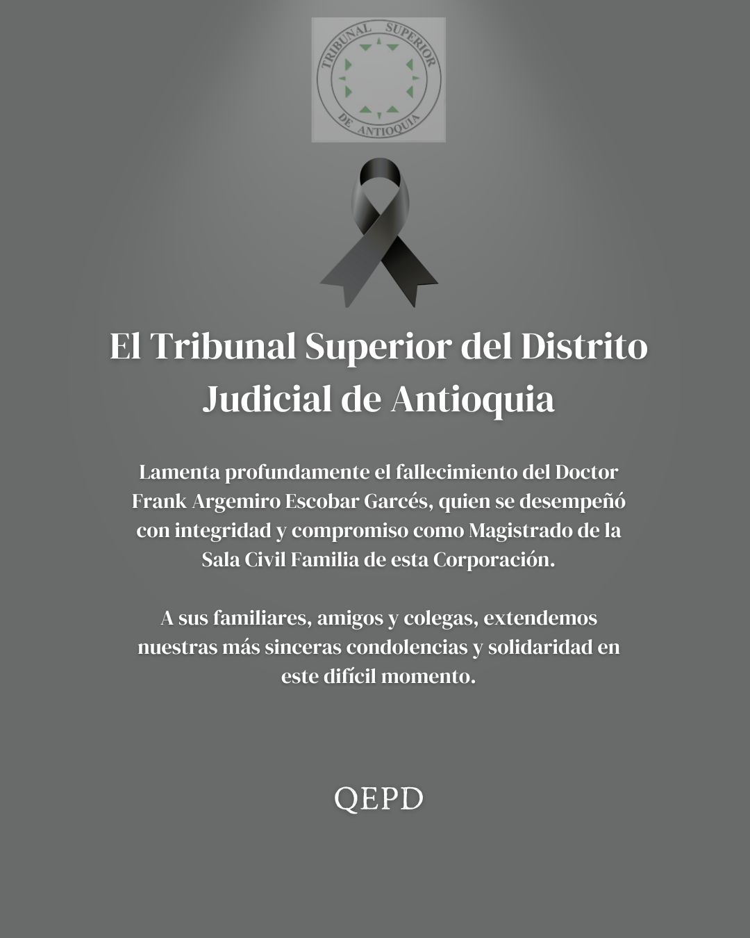 El Tribunal Superior del Distrito Judicial de Antioquia expresa su más profundo pesar por el fallecimiento del Doctor Frank Argemiro Escobar Garcés, quien se desempeñó como Magistrado de la Sala Civil Familia de esta Corporación.