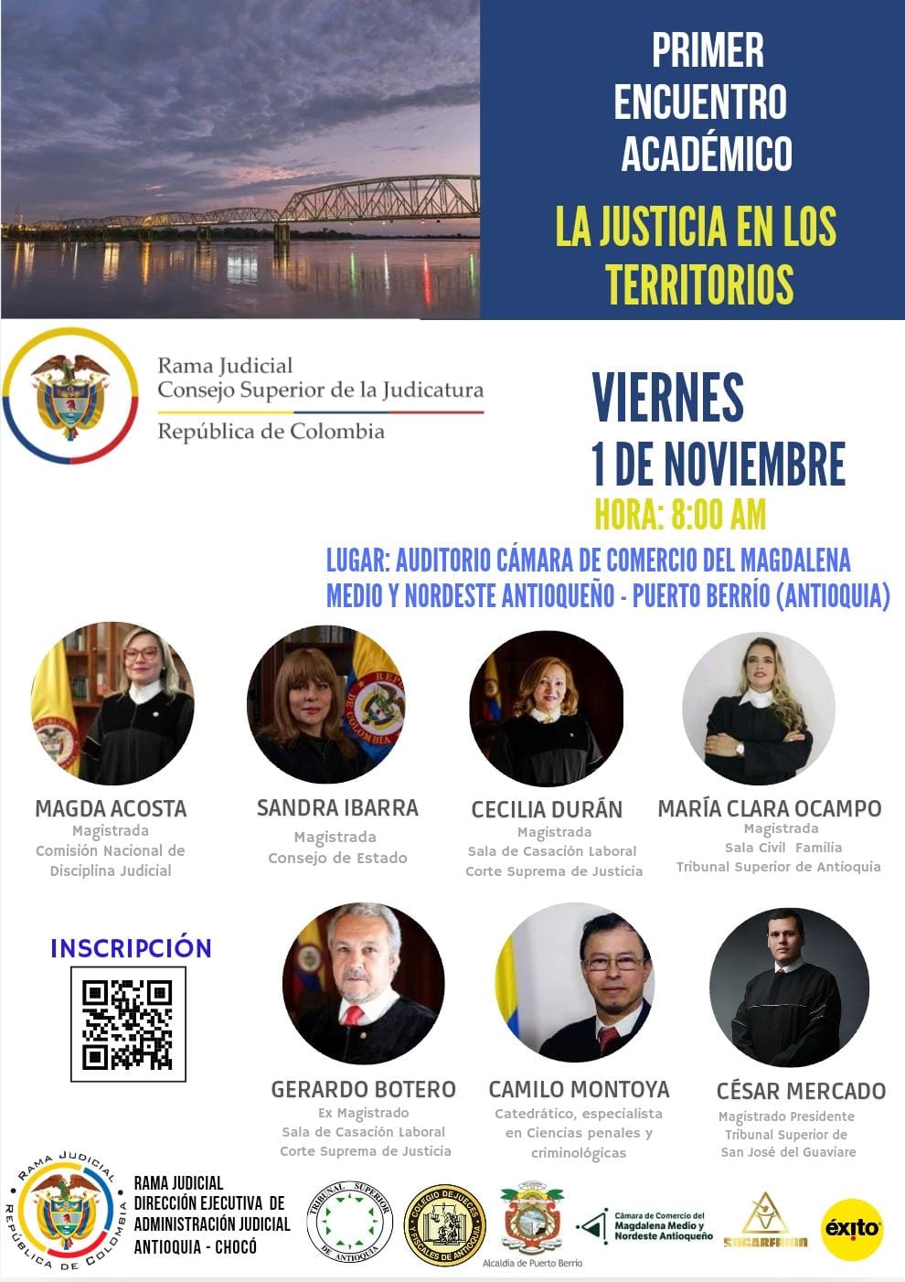 El 01 de noviembre de 2024, en el municipio de Puerto Berrío – Antioquia, se llevará a cabo el primer encuentro académico “La justicia en los territorios”, organizado por los jueces de Puerto Berrío, con el apoyo, entre otros, del Consejo Superior de la Judicatura, la Dirección Ejecutiva de Administración Judicial Antioquia y el Tribunal Superior del Distrito Judicial de Antioquia.