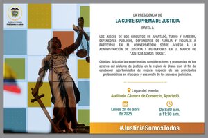 El Tribunal Superior del Distrito Judicial de Antioquia, hace extensiva la invitación a todos los funcionarios del Distrito Judicial de Antioquia, y en especial a los jueces de los municipios de Apartadó, Dabeiba y Turbo, para participar en el conversatorio sobre acceso a la administración de justicia y reflexiones en el marco de "Justicia somos todos" organizado por la presidencia de la Corte Suprema de Justicia. Dia: 28 de abril de 2025. Lugar: auditorio Cámara de Comercio, Apartadó.